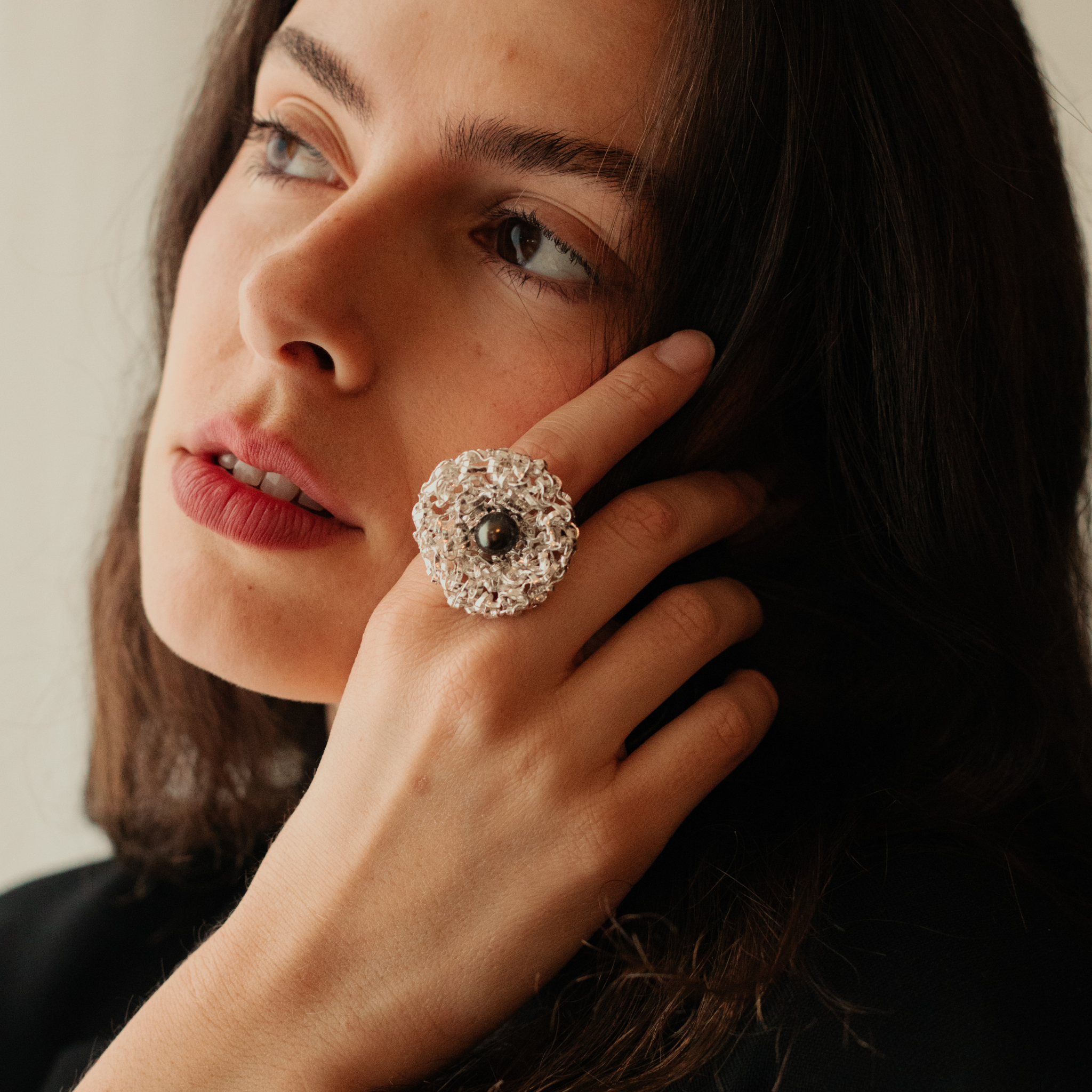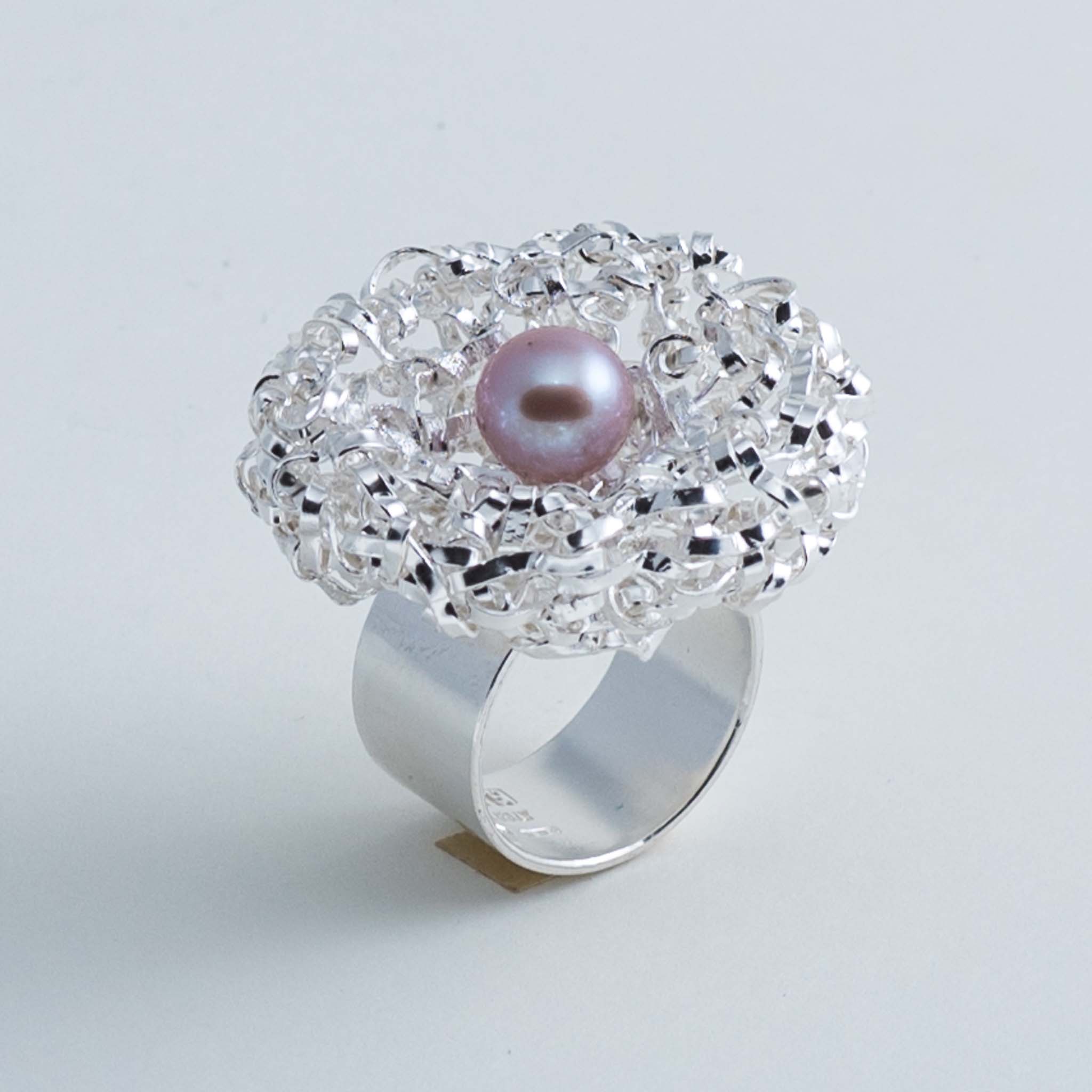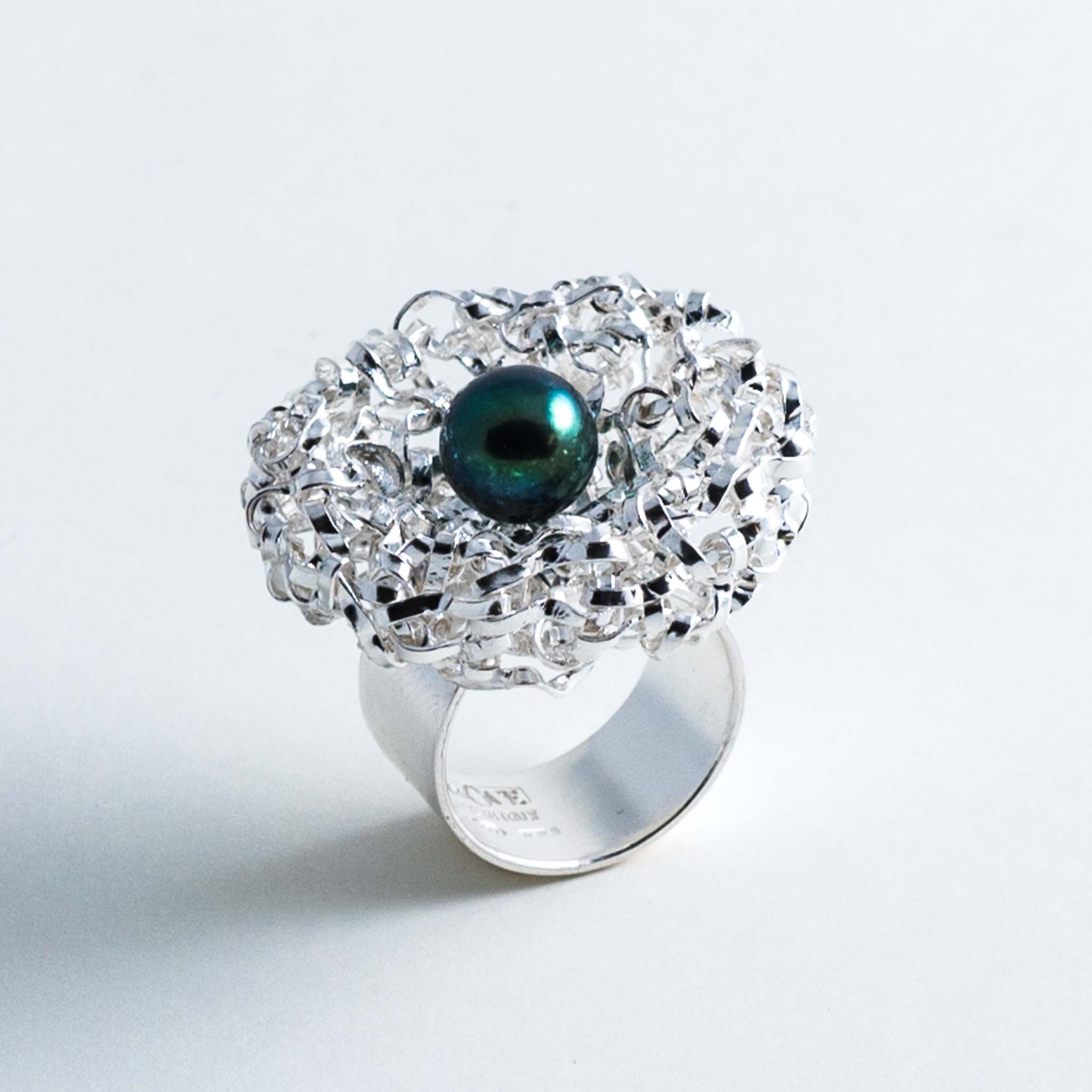 La structure ronde de la bague est réalisée grâce à une technique de tressage manuel unique, à partir d'un fil d'argent. Ce procédé confère aux bijoux de la collection un aspect à la fois saisissant, léger et agréable à porter. La qualité de fabrication leur apporte brillance et résistance.