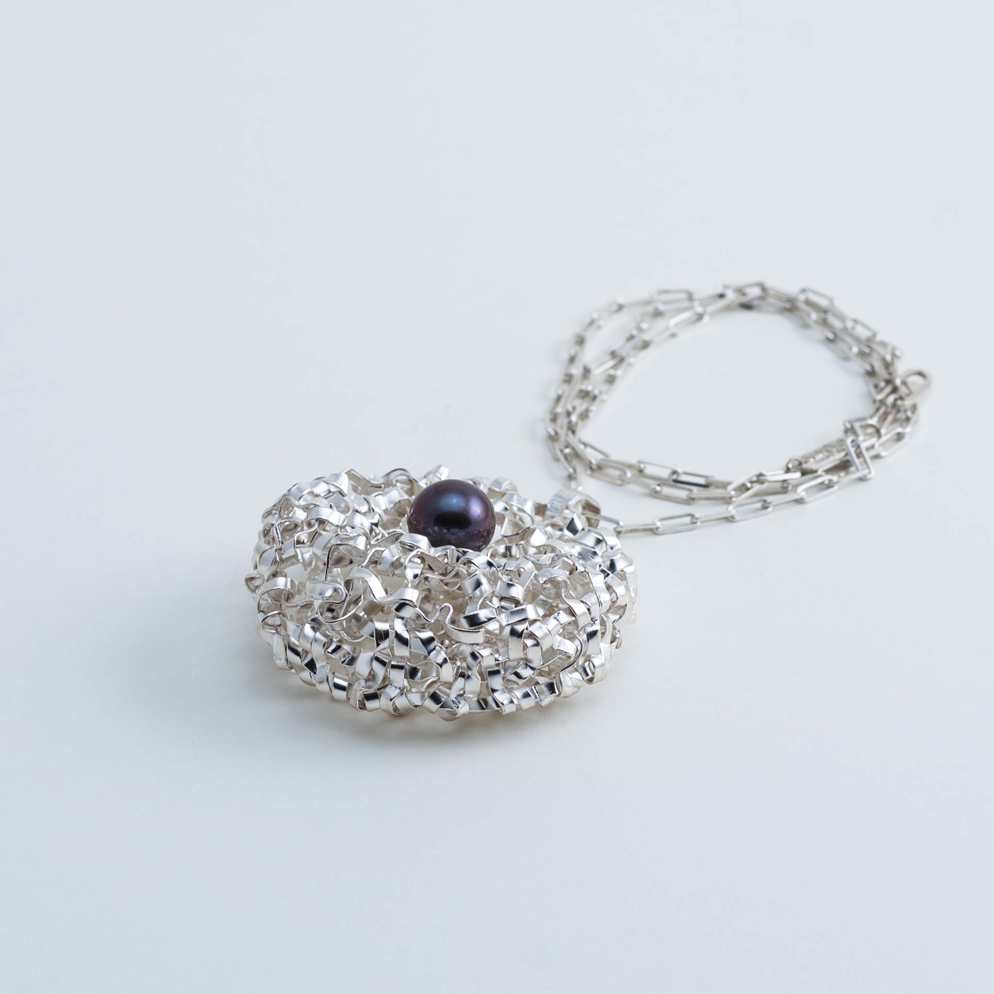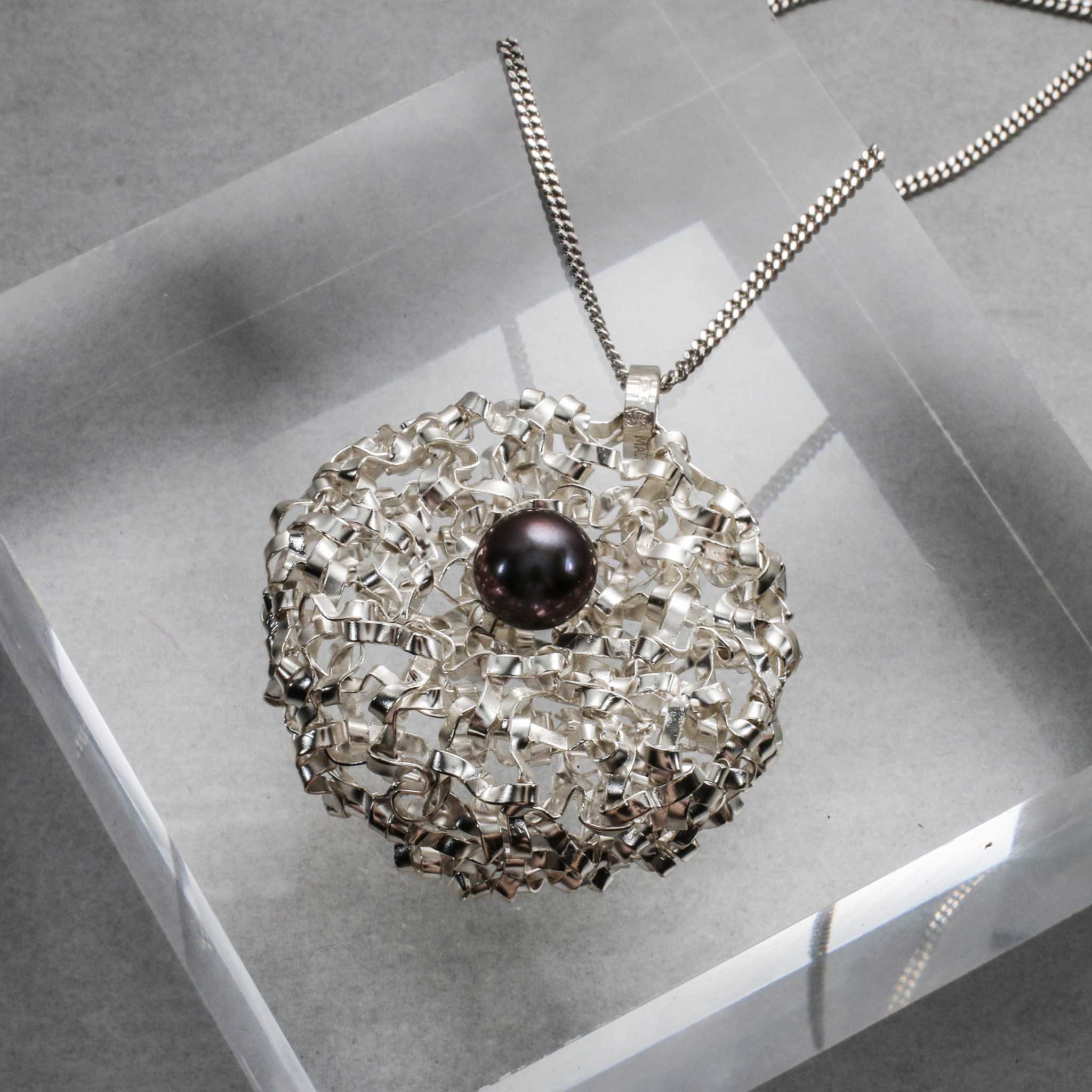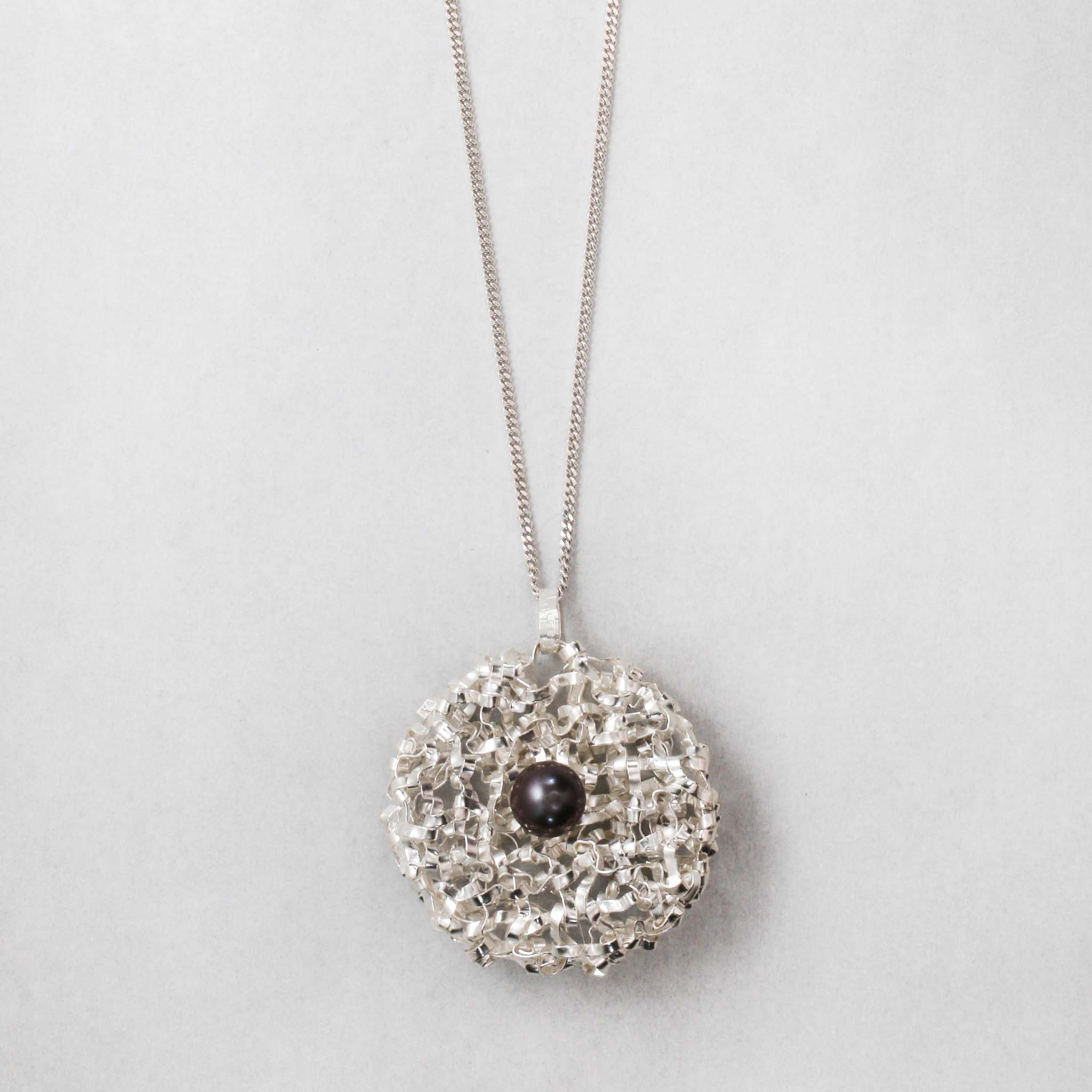 La structure ronde du pendentif est réalisée selon une technique de tissage manuel unique, à partir d'un simple fil d'argent sur lequel est montée une perle d'eau douce de 10 mm.