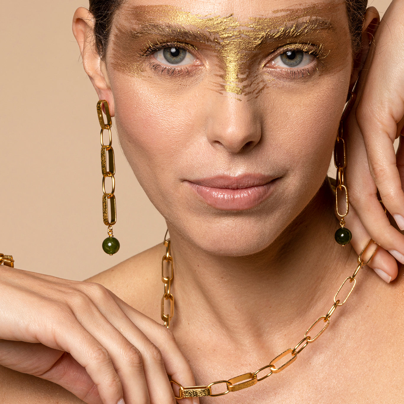 Ces boucles d'oreilles à maillons larges en jade mêlent des éléments masculins et féminins.Minimalistes, audacieuses et riches en contrastes.